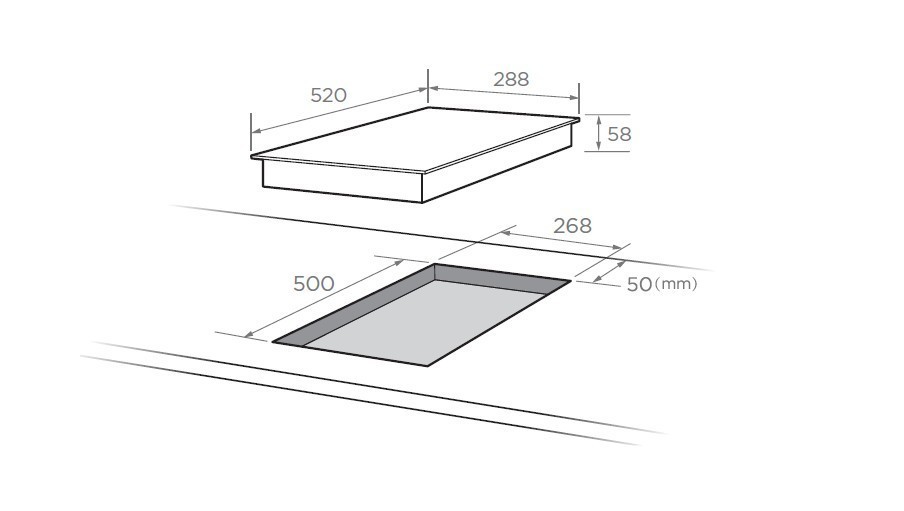 Для установки варочной поверхности необходима рабочая поверхность толщиной не менее 30 мм, в которой производится вырез по размерам согласно схеме встраивания. По периметру выреза необходимо установить самоклеящуюся термоизоляционную ленту, которая идет в комплекте (в некоторых моделях она уже наклеена по периметру варочной поверхности). Под варочной поверхностью можно устанавливать духовки, оснащённые охлаждающим вентилятором, при этом необходимо обеспечить пространство между варочной поверхностью и духовым шкафом минимум 5 мм.