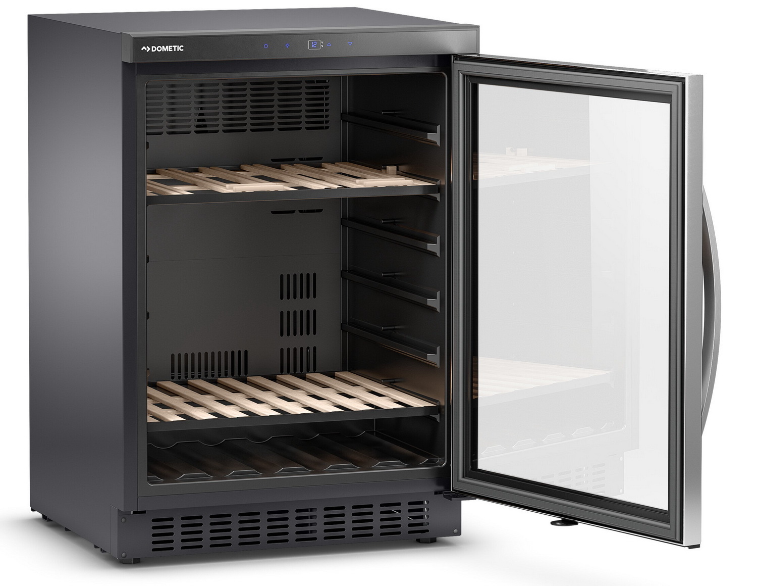 В винных шкафах Dometic, в отличие от большинства других производителей, применяется периметральное освещение. Светодиодные лампы находятся с обеих сторон винного шкафа и расположены так, что свет на полку идет с двух сторон. Теперь выбрать нужную бутылочку вина в темное время суток не представляется сложным: двухстороннее освещение ярко подсветит этикетку. И конечно, подсветка с двух сторон и каждой полки создает неповторимое эстетическое удовольствие, когда вы любуетесь своей винной коллекцией. Система освещения работает в двух режимах: горит постоянно или включается при открытии дверцы. Второй вариант эксклюзивно используется только в винных шкафах Dometic.