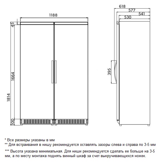 - объем 784 литра (236 бутылок, емкостью 0,75 литра типа Бордо). Максимальная загрузка 396 бутылок (при демонтаже нескольких полок).