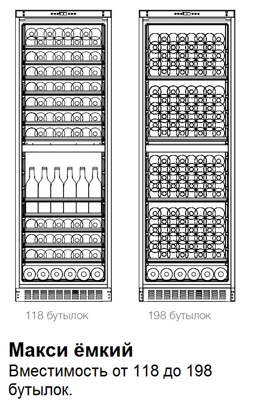 - объем 392 литра (118 бутылок, емкостью 0,75 литра типа Бордо). Максимальная загрузка 189 бутылок (при демонтаже нескольких полок).