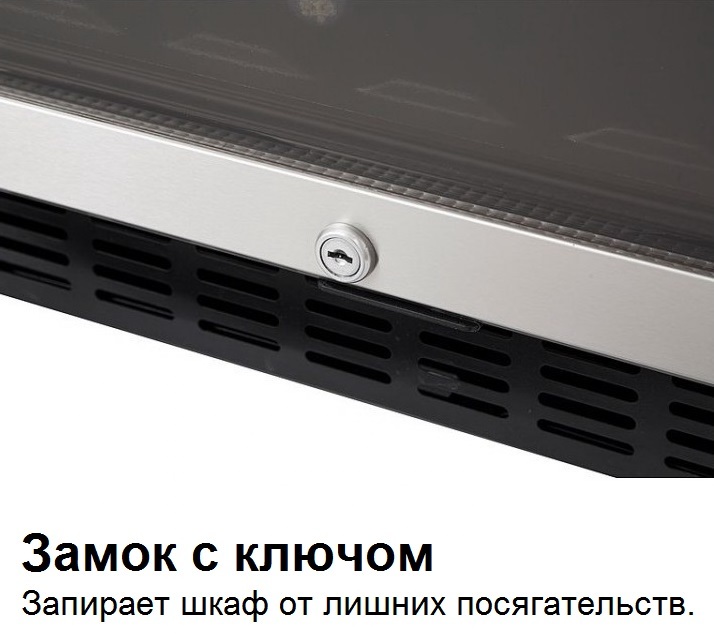 Для защиты вашей винной коллекции от лишних посягательств, винные шкафы Dometic оборудованы замком. Замок располагается либо на дверце (у винных шкафов с рамой из нержавеющей стали), либо на цокольной решетке (для моделей с полностью стеклянными дверьми). Также стоит отметить, что для замков используются именно ключи, в отличие от большинства производителей винных шкафов, использующих шестигранники. Замок рекомендуется использовать покупателям с маленькими детьми, а также в ресторанах.