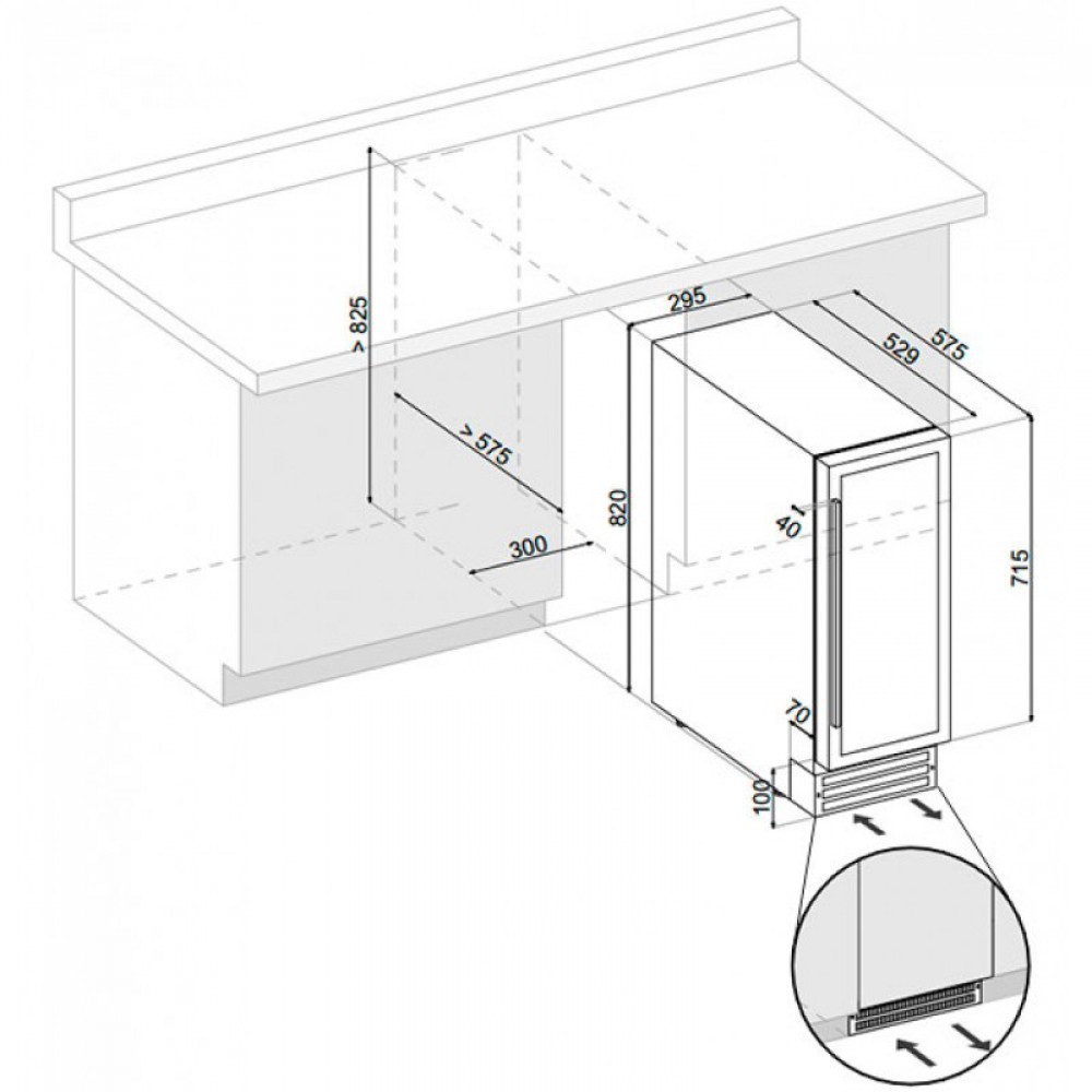 Винный шкаф Dunavox DAU-17.57DB c легкостью встраивается под столешницу, может устанавливаться в нишу или использоваться как отдельностоящий. Охлаждение компрессора происходит через вентиляционные решетки внизу шкафа, что позволяет встраивать винный холодильник без зазоров.