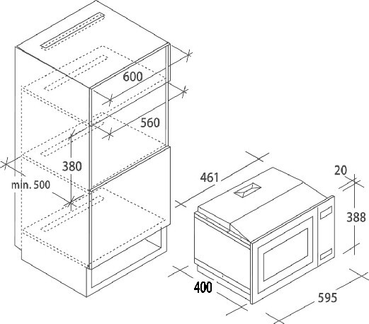 Прибор устанавливается в мебельную нишу с размерами согласно схеме встраивания. Микроволновая печь должна быть заземлена. Прибор оснащен шнуром питания и вилкой. Вилку необходимо вставлять должным образом, установленную и заземленную розетку. Задняя панель корпуса не должна быть закрыта стенкой кухонной мебели. Следите за тем, чтобы вентиляционные отверстия печи не оказались заблокированы. Это может привести к некорректной работе. Используйте только рекомендованную для микроволновых печей посуду. Список рекомендуемой посуды находится в инструкции по эксплуатации.
