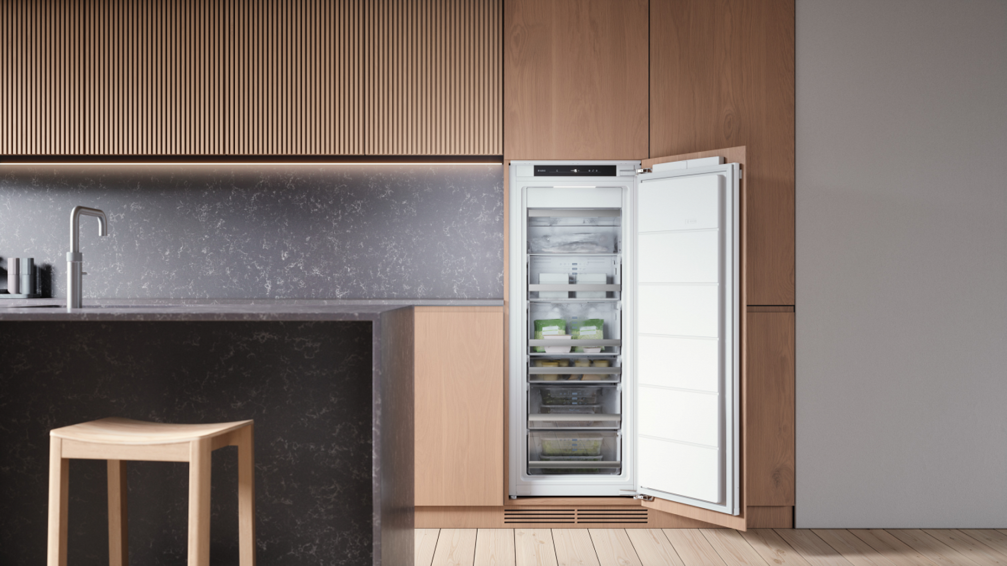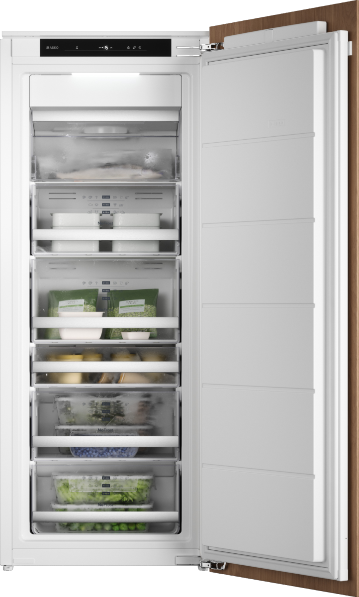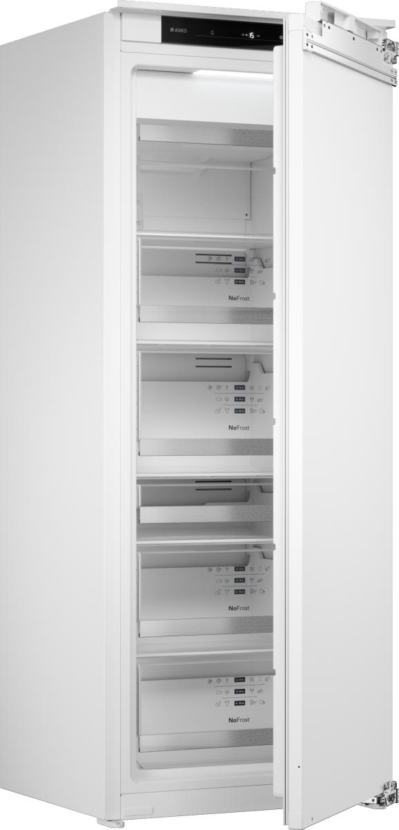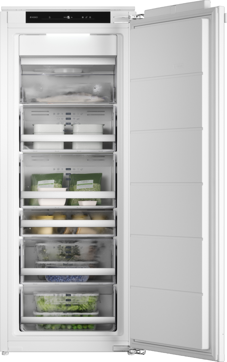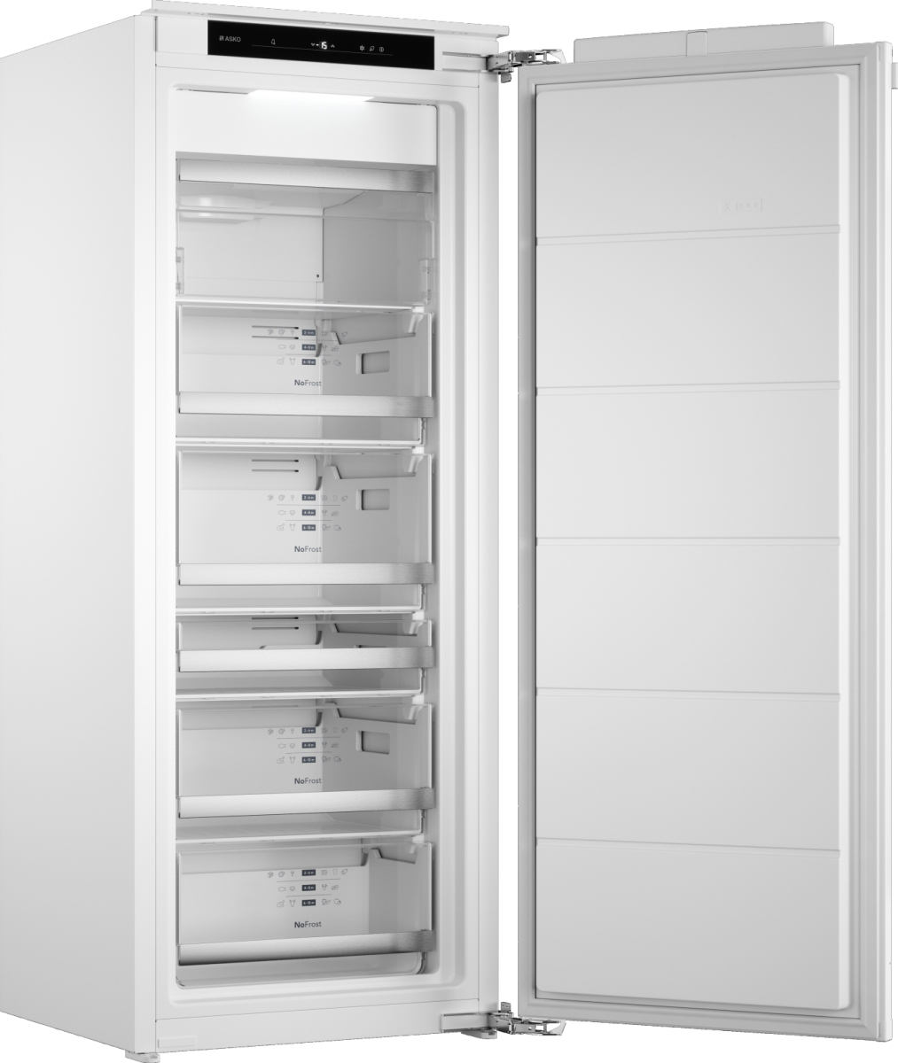 Морозильник Asko FN31442EI высотой 140 см предназначен для встраивания в колонну. Модель предусматривает монтаж фасада по системе door-on-door, оснащена электронным управлением с дисплеем, функцией быстрой заморозки (FastFreeze) и системой NoFrost, исключающей образование инея и необходимость ручной разморозки. Общий объем составляет 151 литр. Внутри — 5 выдвижных ящиков, одна откидывающаяся секция и отдел для крупногабаритных продуктов. Телескопические направляющие и LED-подсветка обеспечивают удобство эксплуатации. Сигнализация открытой дверцы и перегрева оповестит звуком и миганием дисплея. Дверной упор можно перенавесить для удобства, а встроенный доводчик обеспечивает плавное закрытие.