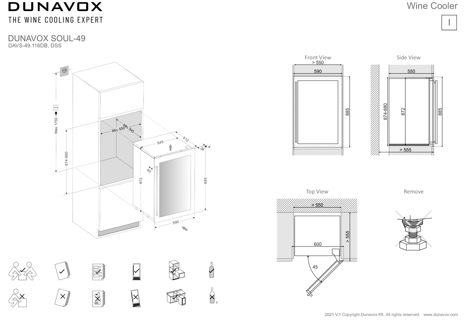 Рекомендуется устанавливать винный шкаф Dunavox вдали от прямых солнечных лучей и источников тепла (духовки, нагревателя, батареи и т.д.). Прямой солнечный свет может плохо повлиять на корпус, а источники тепла могут увеличить энергопотребление. Не рекомендуется устанавливать прибор на полы с подогревом без специальной термоизолирующей подложки. Слишком низкая температура окружающей среды также может быть причиной неправильной работы изделия.