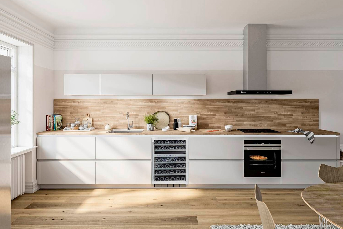 Винный шкаф имеет изящный скандинавский дизайн с четкими линиями, предназначенный для бесшовной интеграции в кухню.
