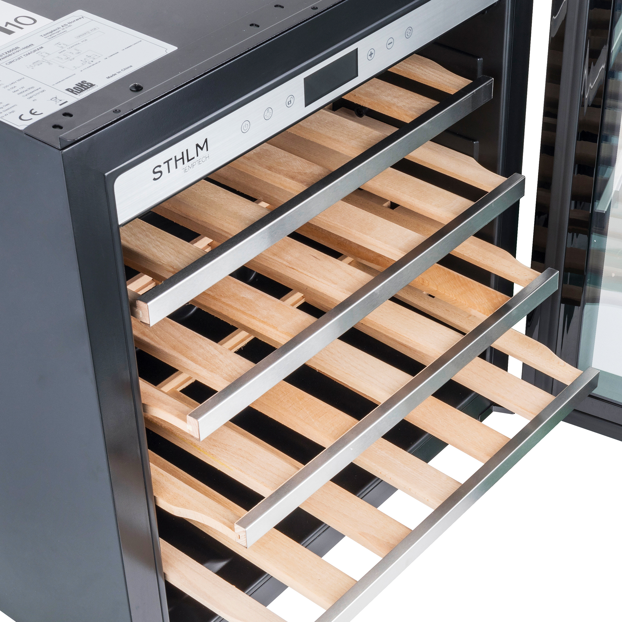 Полки выполнены из неокрашенного бука с нержавеющей сталью, что предотвращает запах. Активный угольный фильтр и УФ-защита дверцы сохраняют свежесть и качество вина. Винный холодильник эффективно поддерживает оптимальную влажность и способствует стабильной температуре благодаря вентиляторам.