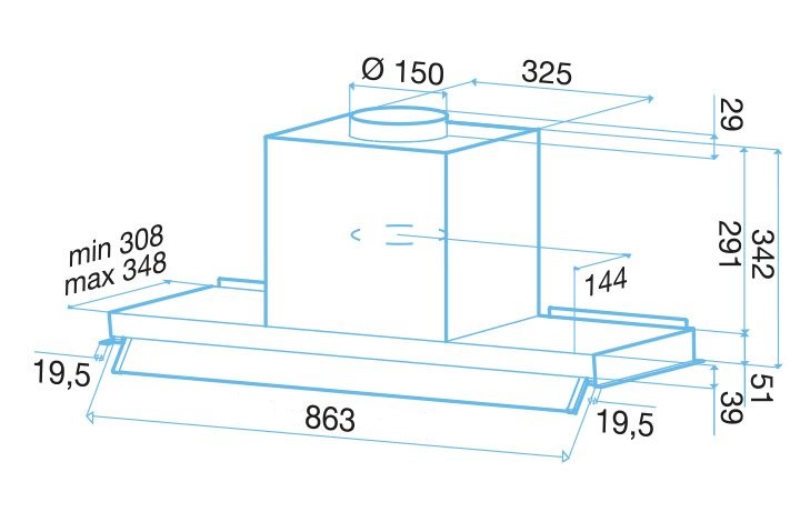 Минимальное расстояние от нижнего края вытяжки до поверхности составляет: газовая поверхность – 52 см, электрическая (блиновая, стеклокерамическая или индукционная) – 40 см.