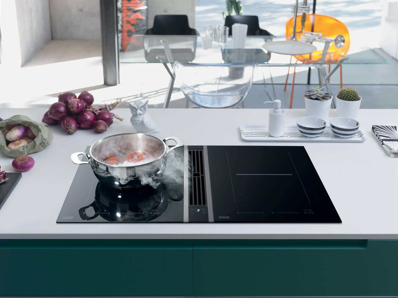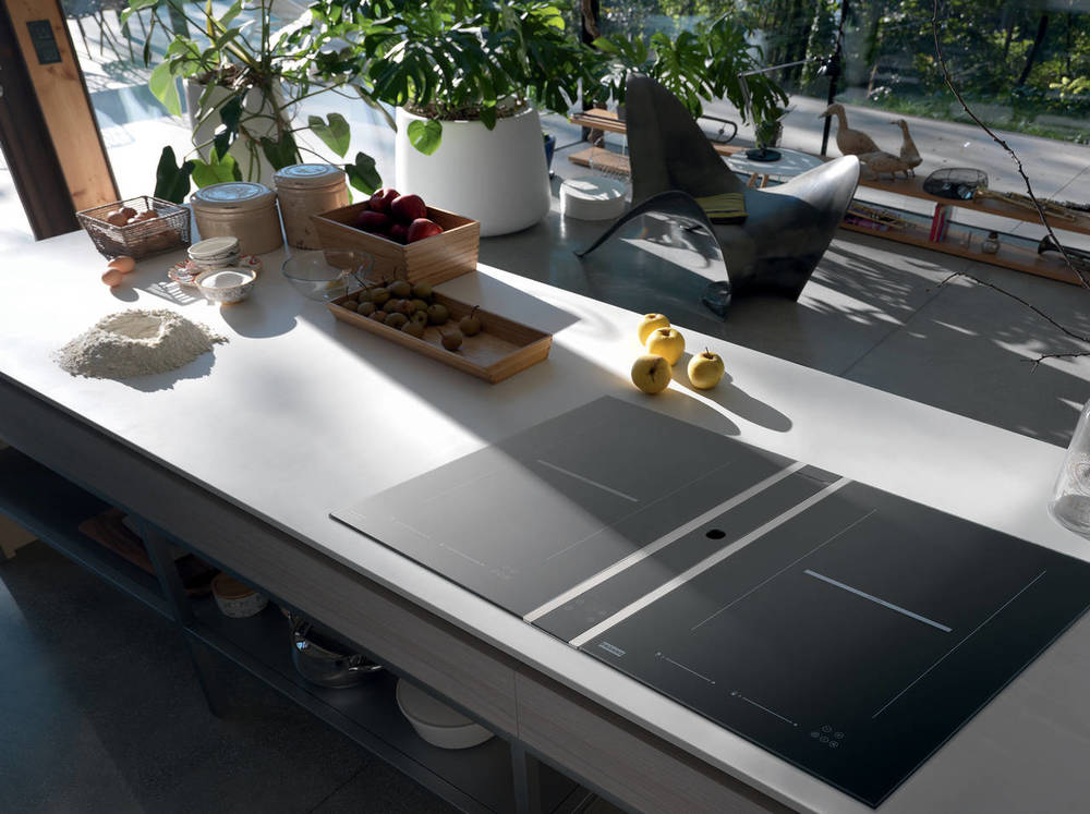 Периметральный захват воздуха гарантирует оптимальную эффективность, основываясь на принципе эффекта Вентури: воздух ускоряется при прохождении узкого места на панели и потом резко теряет скорость при попадании внутрь вытяжки. После этого он может быть легко удален без необходимости в избыточном давлении.